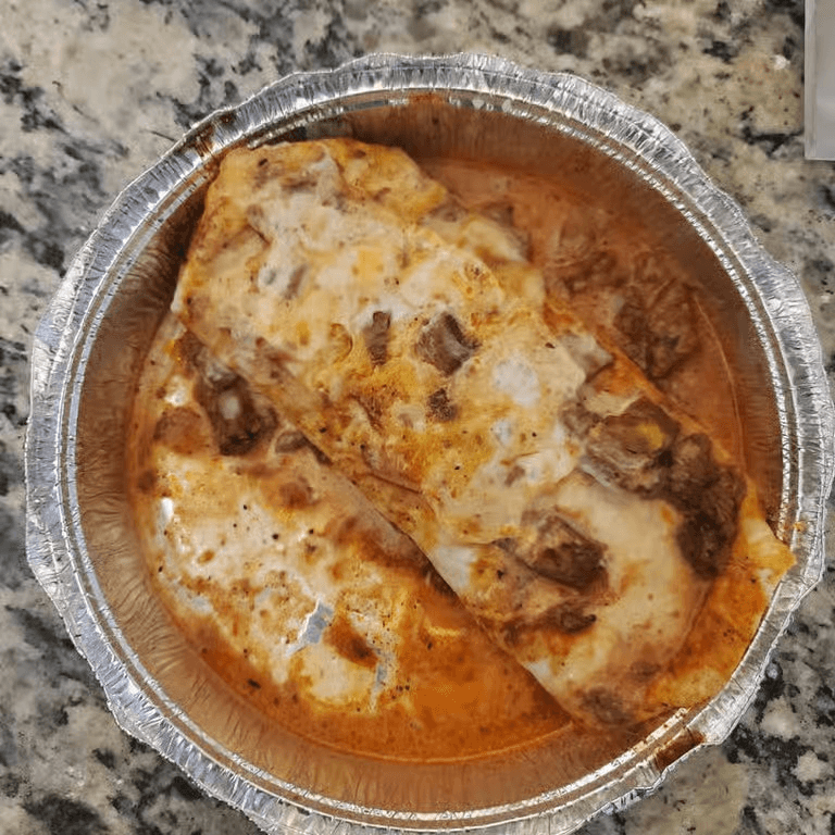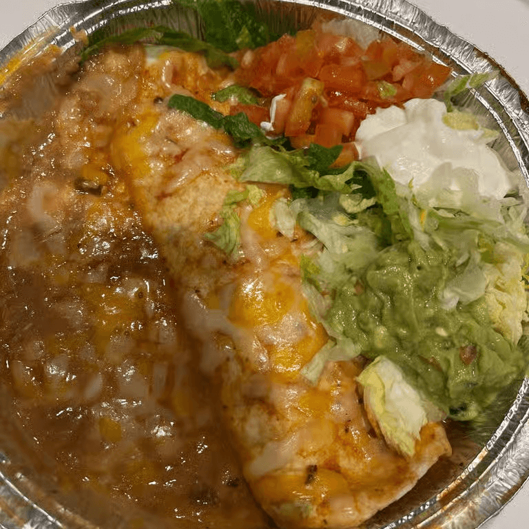 One flour tortilla rolled with ground beef & beans, topped with cheese, lettuce, tomatoes, guacamole, sour cream & rice, or beans on the side, topped with red sauce