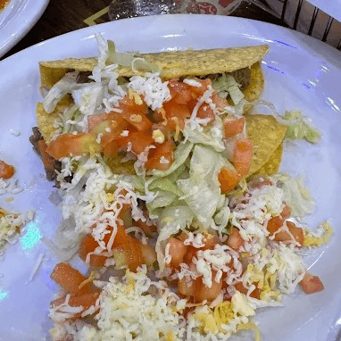 Large crunchy flour tortilla filled with beef, lettuce, tomato, topped with chili con carne & cheese