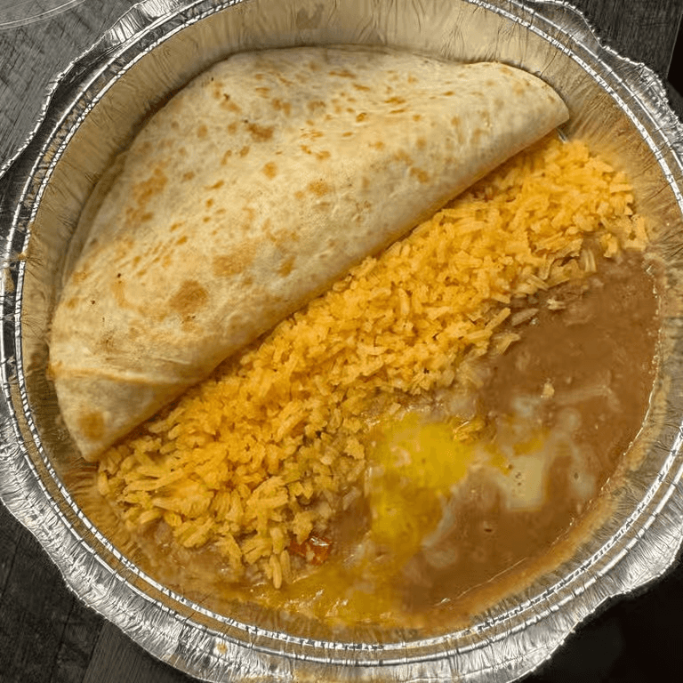 One beef taco & one beef enchilada. Served with rice & refried beans