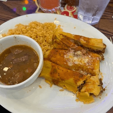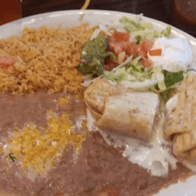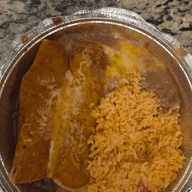 Two beef or chicken enchiladas. Served with rice & refried beans