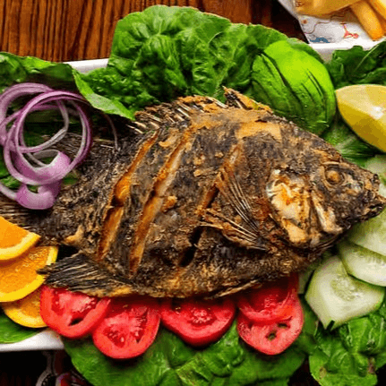 Whole fish lying on a bed of lettuce with tomatoes, onion, cucumber, avocado, lime. With white rice & fries