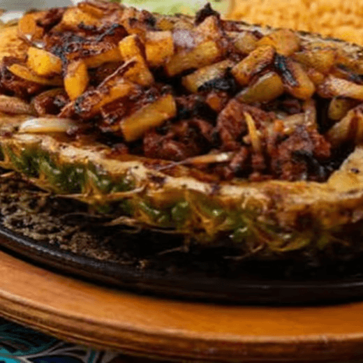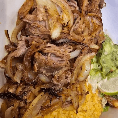 Marinated pork strips in adobo sauce with pineapple & onions. Served with rice, & refried beans, guacamole salad pico de gallo, sour cream & flour tortillas