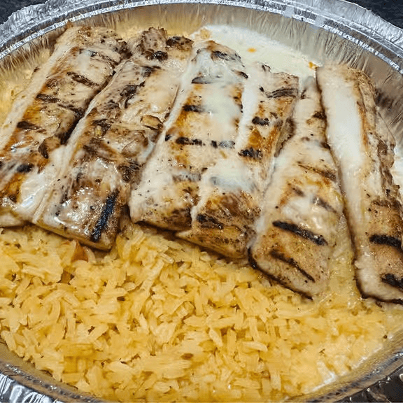 Chicken breast topped with mushrooms, bell peppers & onions. Served with rice, cheese & steamed vegetables