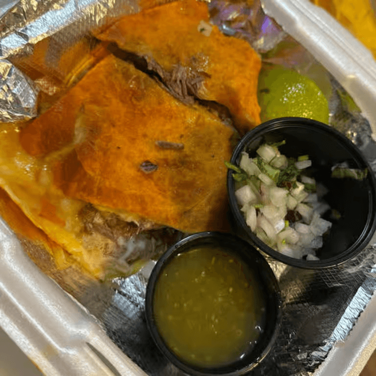 Large quesadilla with cilantro, onion, queso & birria. Served with rice & birria soup on the side