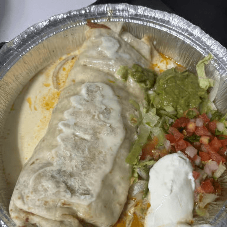 Large flour tortilla rolled with beans, bell peppers, onions, and your choice of meat topped with cheese sauce, lettuce, guacamole, sour cream & pico de gallo