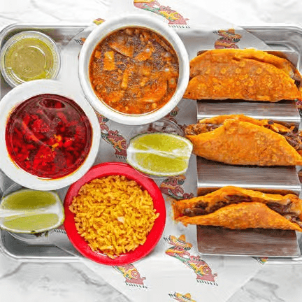 Four rolled fried birria taquitos. Served with rice & birria soup
