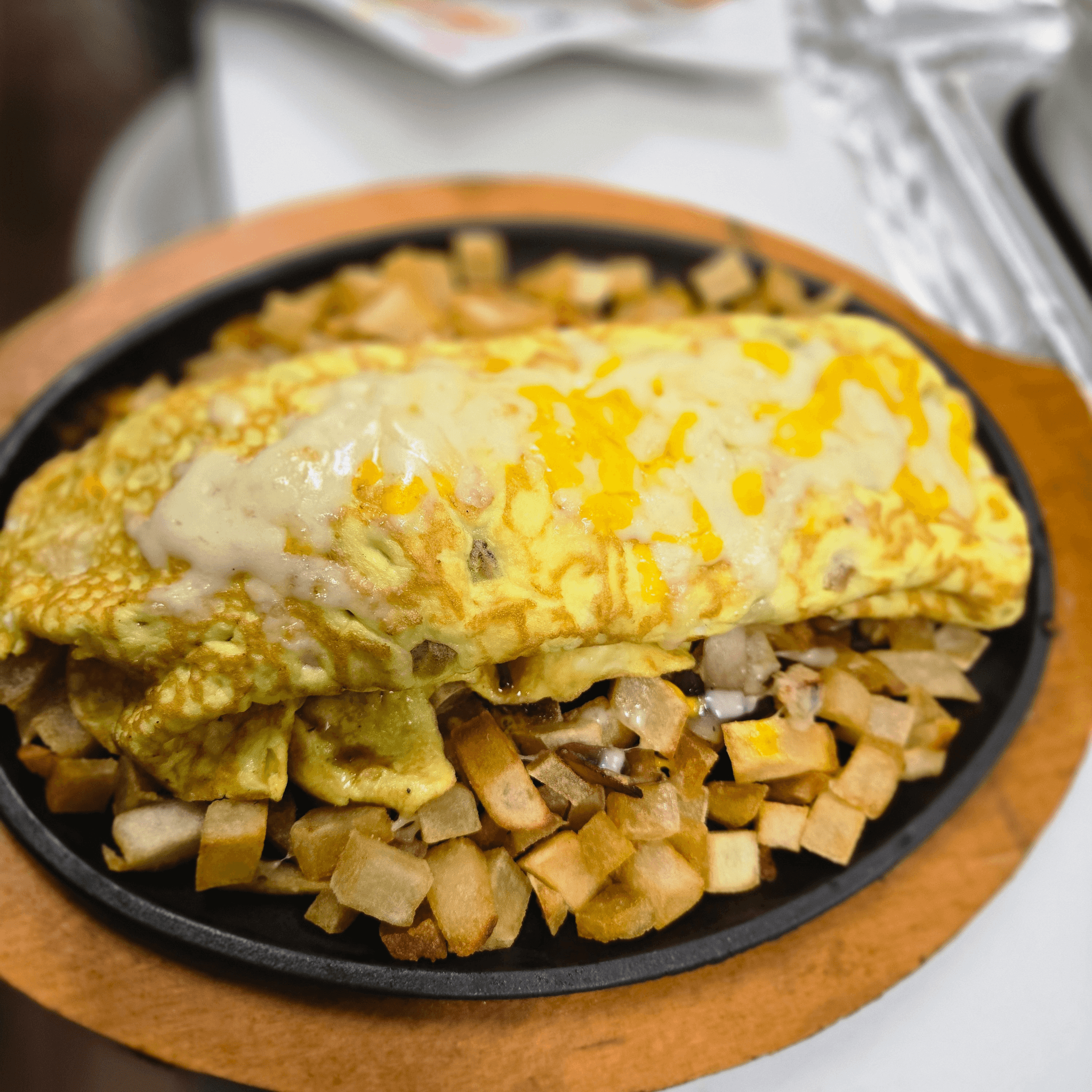 Served with potatoes. All omelets contain cheese, spinach, bell peppers, onions, and mushrooms