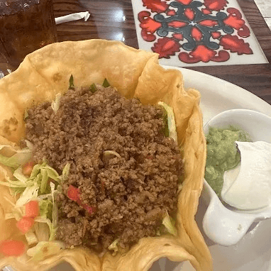 Fried flour tortilla shell filled with lettuce, topped with cheese, guacamole, and sour cream