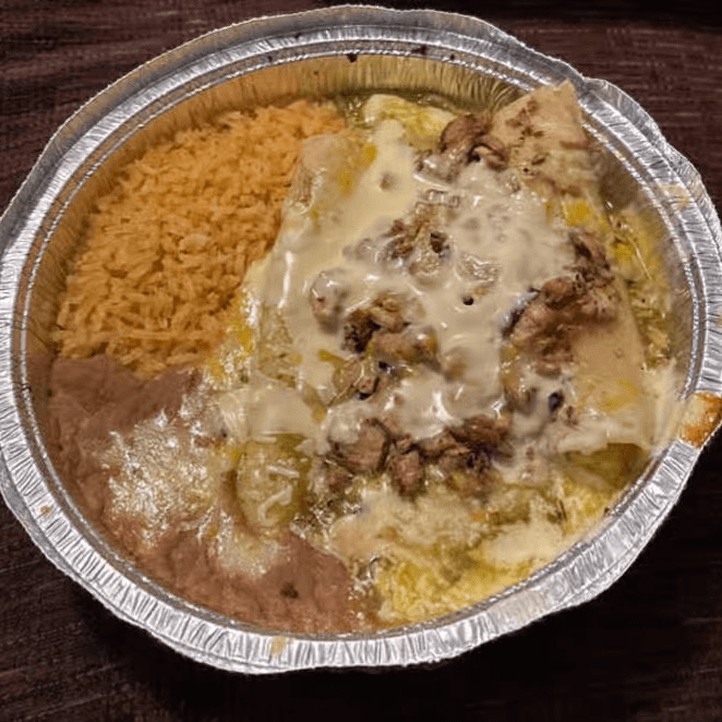Three enchiladas with chicken, steak, or cheese. Topped with cheese dip, green sauce & sliced avocado. Served with rice & refried beans