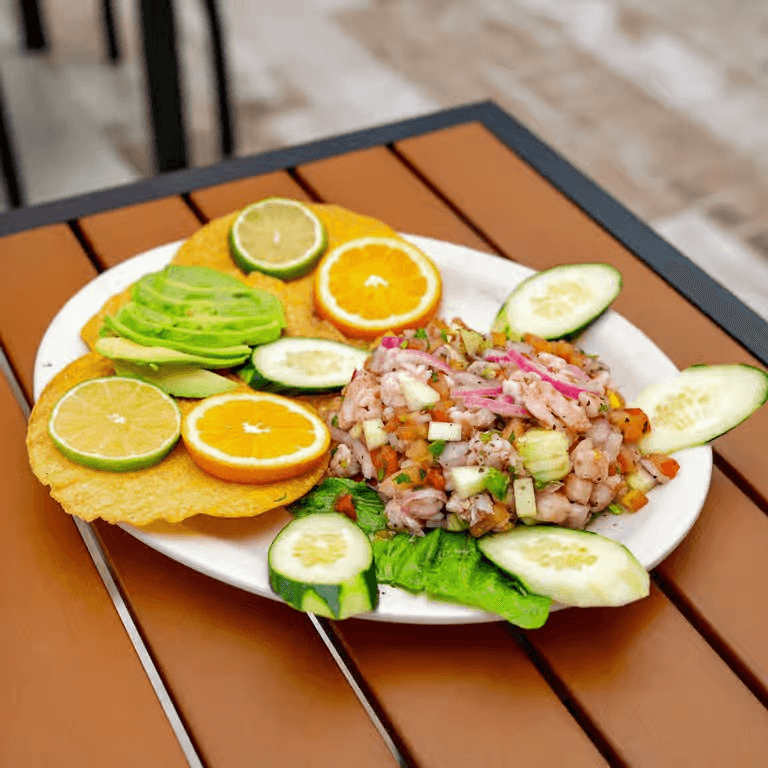 Three crispy corn tortillas covered with chopped fish fillets or shrimp, mixed with pico de gallo & lime juice