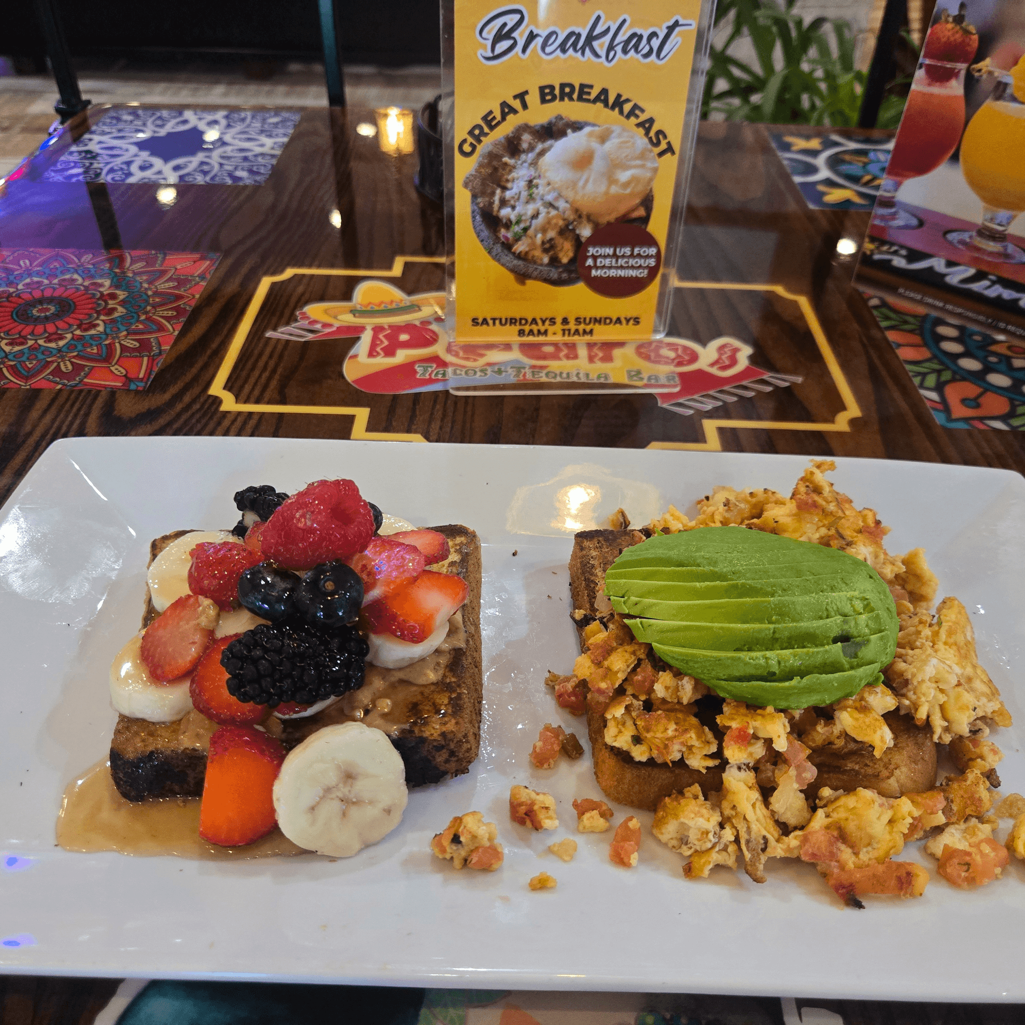1 toast with peanut butter, banana, strawberry, 1 toast with egg & avocado