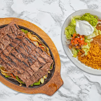 Your choice sizzling with onions & bell peppers; lettuce, tomatoes, sour cream, and guacamellur tortillas included on the side. Served with rice & refried beans